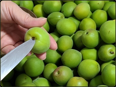 2. 매실 깍기: 매실 표면의 털을 제거하고 크기가 큰 매실은 잘게 썹니다.